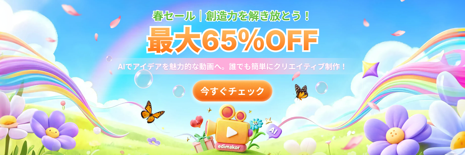 AI動画編集ソフト「HitPaw Edimakor」は、期間限定の「2026年春セール」を2026年3月3日16時から3月16日16時まで実施します。VIPプランとAIクレジットを最大65%割り引くほか、特典として最大2,000クレジットを無料で付与します。