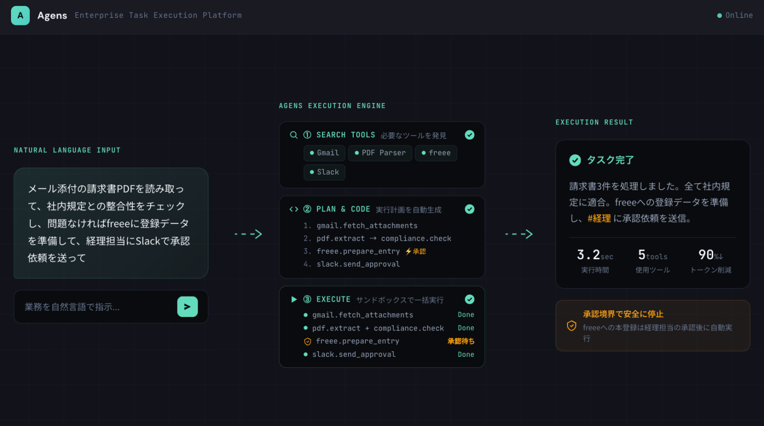 Executionは自然言語の指示からツールを自動発見し、計画を生成してサンドボックスで一括実行します。Controlでは承認ワークフロー、権限管理、監査ログの保存(5年間)を備え、J-SOX対応も想定しています。