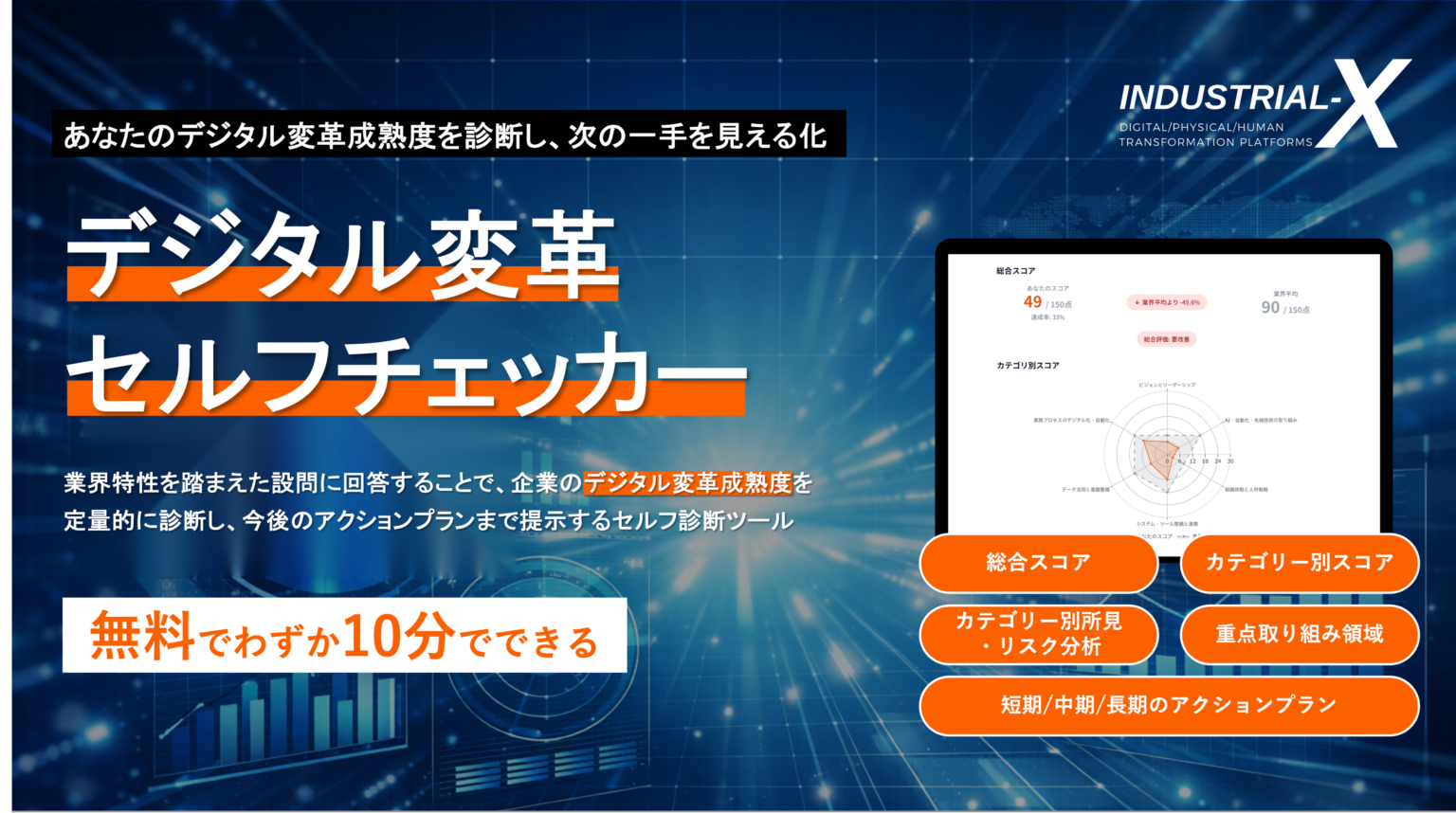 株式会社INDUSTRIAL-X(東京都港区)は2026年3月24日8時30分、自社のデジタル変革(DX)とデータドリブン経営の成熟度を診断できるオンラインツール「デジタル変革セルフチェッカー」をコーポレートサイト上で提供開始します。対象は20業界で、各業界に最適化した50問に回答するとスコアと分析結果を即時表示し、PDFレポートとして出力できます。料金は無料です。