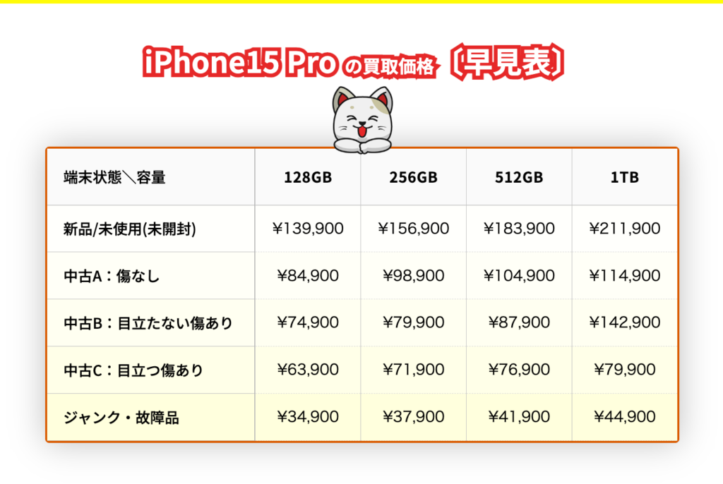 刷新の中心は、容量別(128GB/256GB/512GB/1TB/2TBなど)と状態別(美品、傷あり、画面割れ等)で表示する自社の買取価格表です。従来は他社比較表が中心で自社価格が伝わりにくかったため、情報取得から売却申し込みまでを最短化する狙いです。