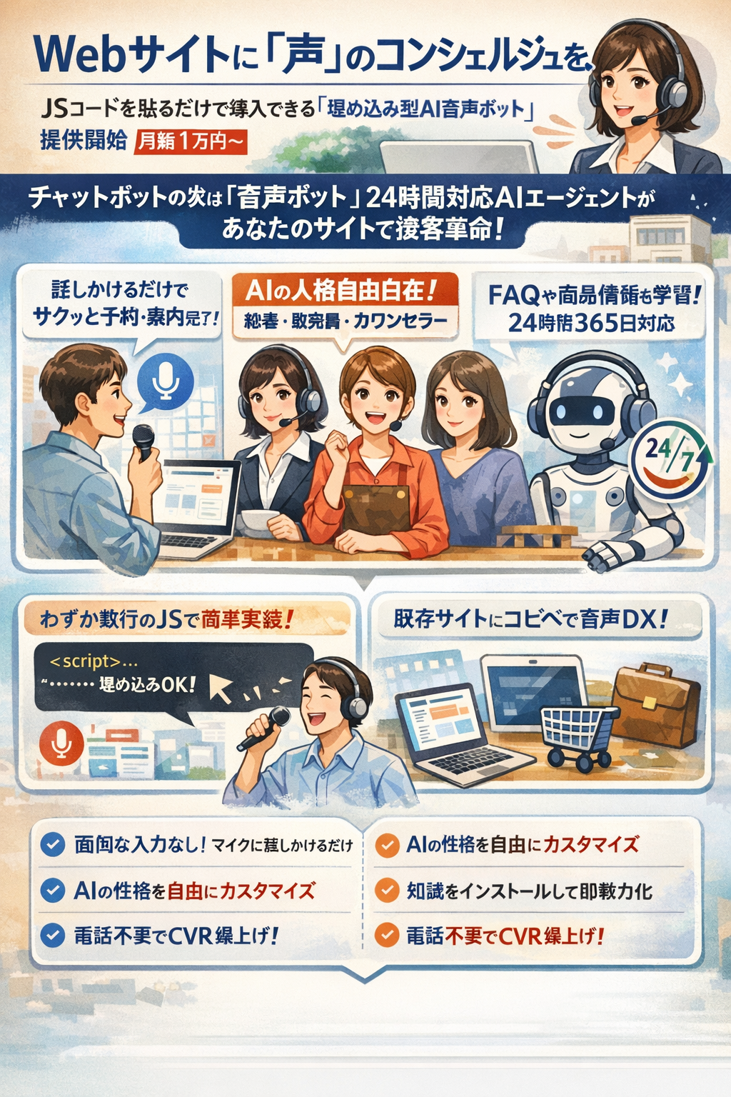 Legal AI株式会社(東京都)は、Webサイトに数行のJavaScriptコードを埋め込むだけで導入できる「埋め込み型AI音声ボット」の提供を始めました。訪問者と音声で自然に対話し、24時間365日で案内や問い合わせ対応を行います。料金は税別で月額基本料1万円から(年契約)で、AIの利用量に応じた従量課金も設定しています。