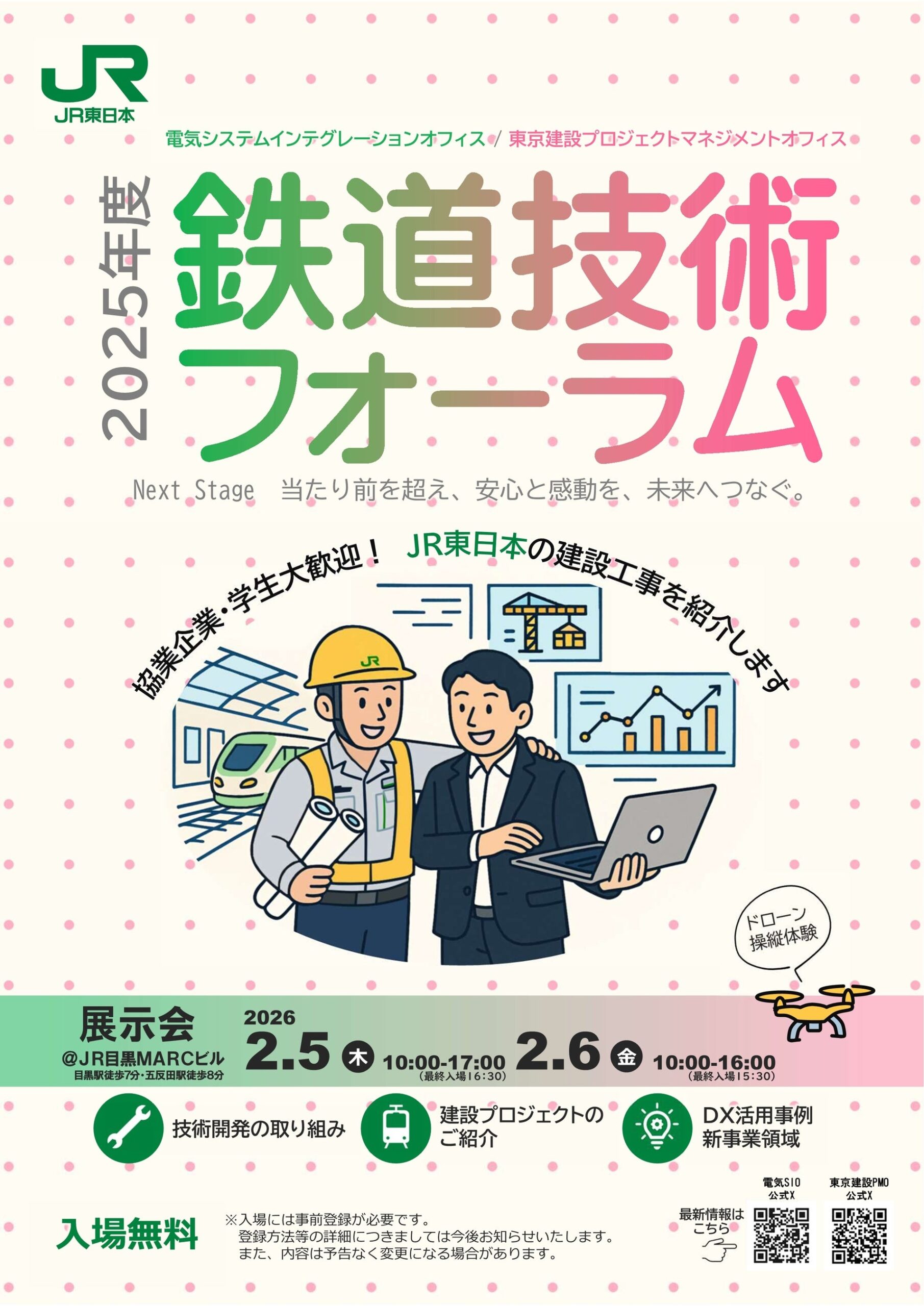 JR東日本は「2025年度鉄道技術フォーラム」を2026年2月5日と6日にJR目黒MARCビル(東京都品川区)で開きます。1992年度から34年連続となる34回目で、建設分野と電気分野の新事業・DX(デジタル技術で業務やサービスを変革する取り組み)や技術開発成果を展示56件で紹介します。会場は3階大会議室で、初日は10時〜17時(最終入場16時30分)、2日目は10時〜16時(最終入場15時30分)です。展示はパネルや現物体験を通じた意見交換を想定し、列車制御、エネルギー、情報通信などのテーマを扱います。体験企画としてVRシミュレーター、ドローン、学生イベントも予定されています。参加は専用サイトで会員登録後に事前登録が必要で、登録開始は2026年1月15日14時から、先着順となります。混雑状況により入場人数を制限する場合があり、鉄道関連技術の交流機会として継続的な情報発信が続く見通しです。【イベント情報】