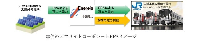 契約はオフサイトコーポレートPPA(発電所と需要家が長期で電力購入契約を結び、送配電網を介して供給を受ける方式)を用いる。先行して計画する導入分と合わせると、JR西日本の在来線全体の運転用電力(年間約16億kWh)のうち約13%が再エネに置き換わるとしている。
