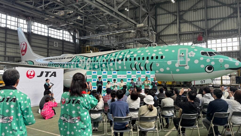 同機は沖縄美ら海水族館とのコラボレーション機で、ジンベエザメをモチーフに「森の緑」と「海の緑」を掛け合わせたクリエイティブを機体デザインへ反映しています。搭乗客だけでなく空を見上げる人にも「ワクワク」と沖縄の自然の豊かさ・大切さを伝える狙いです。