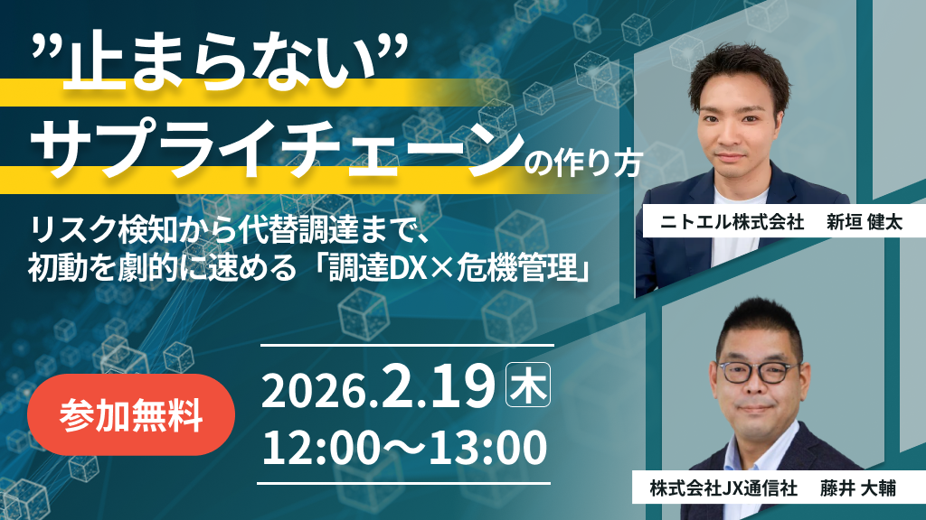 JX通信社(東京都千代田区)とニトエルは、共催ウェビナー「“止まらない”サプライチェーンの作り方」を2026年2月19日(木)12:00〜13:00にZoomで開く。参加費は無料で、調達DXの導入ポイントと、ニュース速報型リスク情報サービス「FASTALERT」を使った早期検知から社内連携までの手法を紹介する。