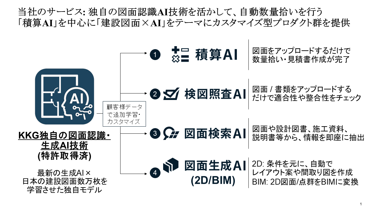 KK Generationは建設図面の読み取りにAIを用いる「建設図面×AI」に特化し、2023年5月に設立されました。同社は同プログラムに採択され、実証実験を経て社会実装に至った事例として、サンゲツ向け「積算AI」の実装内容を説明します。