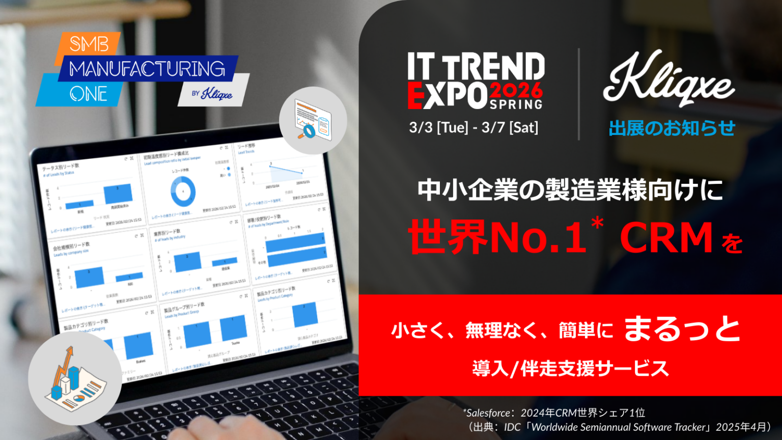 KLIQXE(東京都文京区、代表取締役:木村靖史)は2026年3月2日、中小製造業向けDXサービス「KLIQXE SMB Manufacturing ONE」を発表し、3月9日に提供開始予定としました。あわせて、オンライン展示会「ITトレンドEXPO2026 Spring」(3月3日〜3月7日)の「営業・マーケティング」関連展示エリアに出展し、サービス詳細資料を展示サイトで公開します。