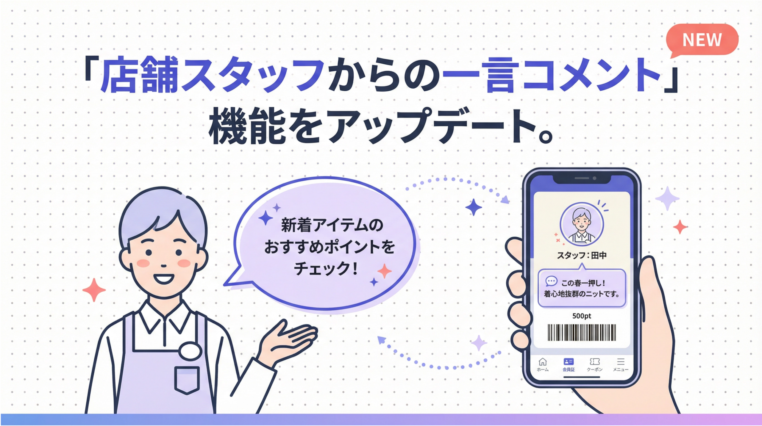 新機能は、管理画面からコメント内容、担当者名、担当者アイコン画像、表示期間(開始日・終了日)を設定し、会員証画面に掲出します。季節の挨拶や新商品・キャンペーン告知、感謝メッセージ、イベント案内などの用途を想定しています。