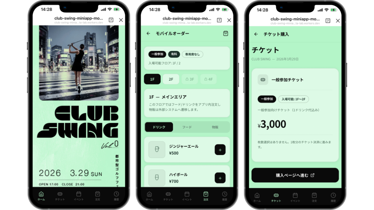 LINEヤフーは2026年3月10日、イベント前後の案内から当日の入場、場内オーダーまでをLINE上でつなぐ「LINEで完結するイベントDXモデル」の提供を始めました。第1弾は都市型ゴルフフェスティバル「CLUB SWING VOL.0」で、開催は3月29日15時〜20時、会場は渋谷WOMB(東京都渋谷区円山町2-16)です。一般チケットは3,000円(税込、1ドリンク込み)としています。
