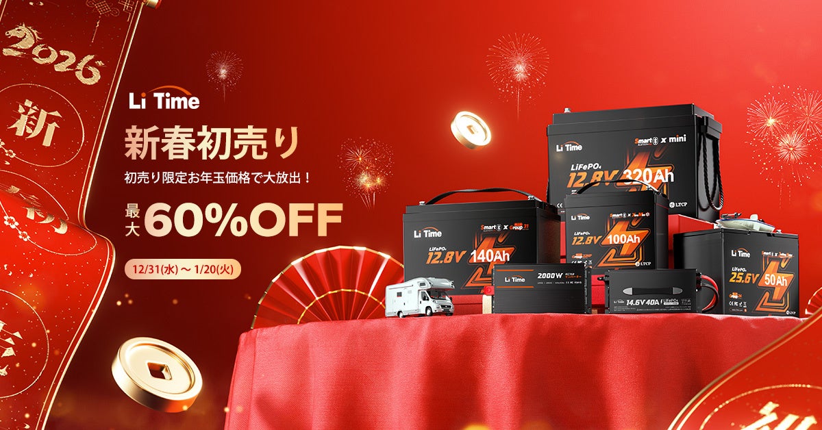 エネルギーソリューションブランド「LiTime(リタイム)」は、公式オンラインストアで「新春初売りセール」を実施しています。期間は2025年12月31日から2026年1月20日までで、割引率は最大60%です。対象は12V/24V/48VのLiFePO4(リン酸鉄リチウムイオン)バッテリーを中心に、充電器、インバーター、走行充電器、MPPT(太陽光の発電効率を高める充電制御装置)、アクセサリーまで含まれます。車中泊やキャンピングカーのサブバッテリー強化、家庭用バックアップ電源、防災備蓄、ソーラー併用のオフグリッド構成などを想定し、電源システム一式の見直しに使える商品構成としています。会員向けにはポイントを「8%OFFクーポン」に交換できる仕組みも用意され、セール価格に加えて追加割引が可能です。一方、対象商品や在庫、特典内容は予告なく変更・終了する場合があるため、購入時はキャンペーンページで条件の確認が必要です。今後は、車載・家庭向けの分散電源需要の高まりを背景に、バッテリーと周辺機器をセットで選べる販促が継続する可能性があります。