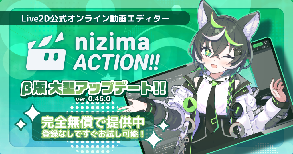 2Dアニメ表現技術Live2Dを開発する株式会社Live2Dは8日、オンライン動画エディター「nizima ACTION!! β版」を大幅アップデートし、登録・ログイン不要でURLからすぐ動画編集を試せる匿名ログイン機能を実装しました。あわせて効果音素材を1300点以上追加し、トラッキングソフト「VTube Studio」との連携にも対応しました。