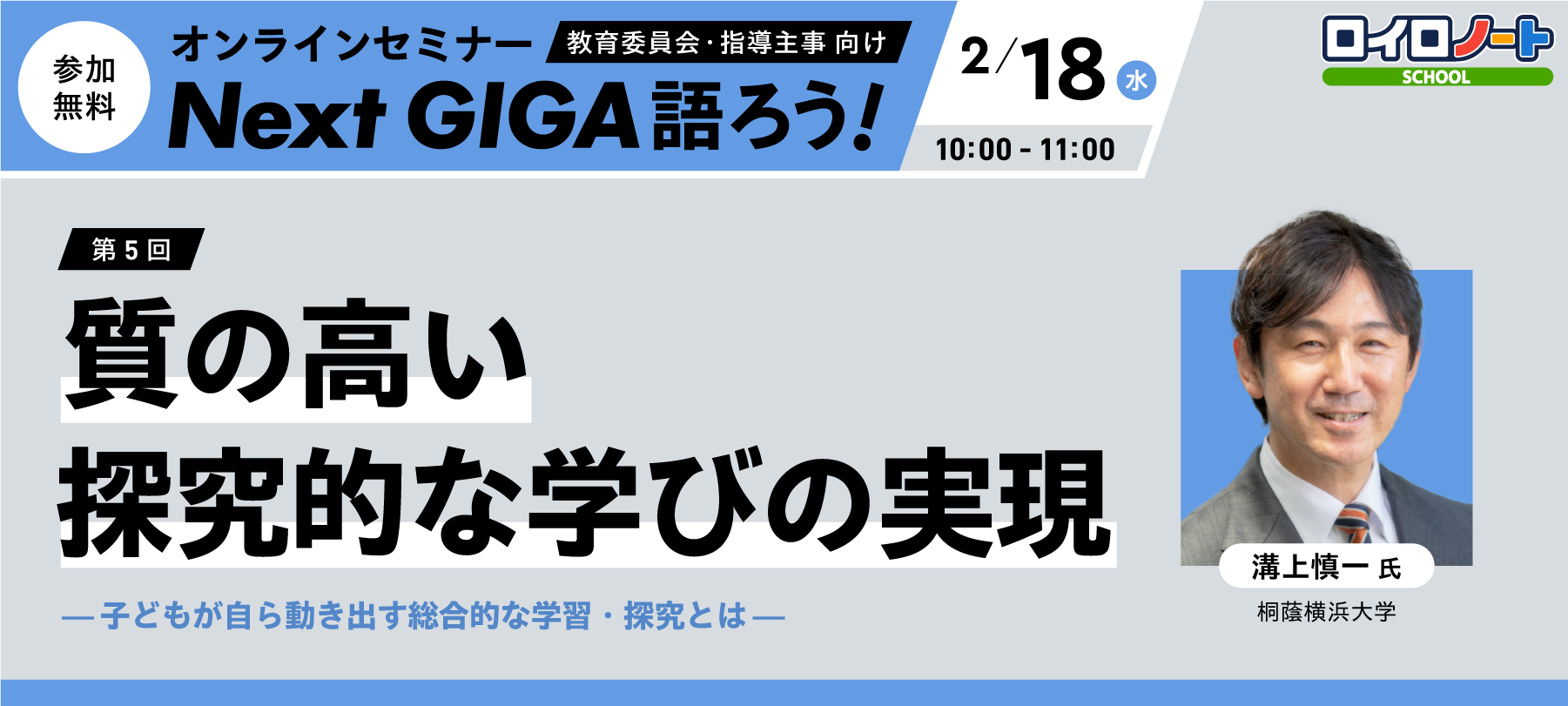 LoiLoは2月18日(水)10:00〜11:00、教育委員会や学校関係者向けオンラインセミナー「Next GIGA語ろう!2026」第5回をZoomで開きます。テーマは「質の高い探究的な学びの実現」で、参加費は無料です。
