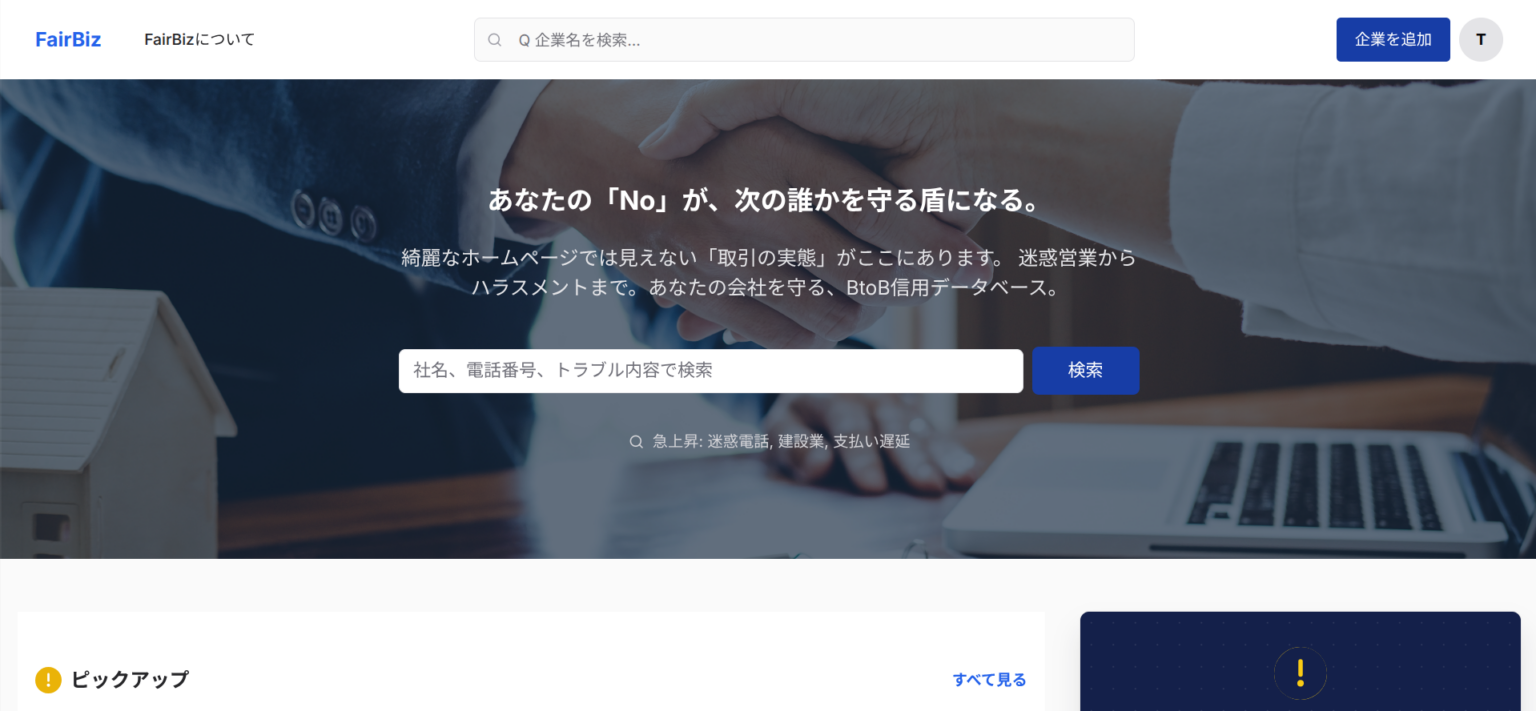 今後は、投稿データを基にした業界別トラブル傾向レポートの公開、優良企業を認定する「FairBiz認定制度」、弁護士連携によるトラブル解決支援機能の実装を予定しています。