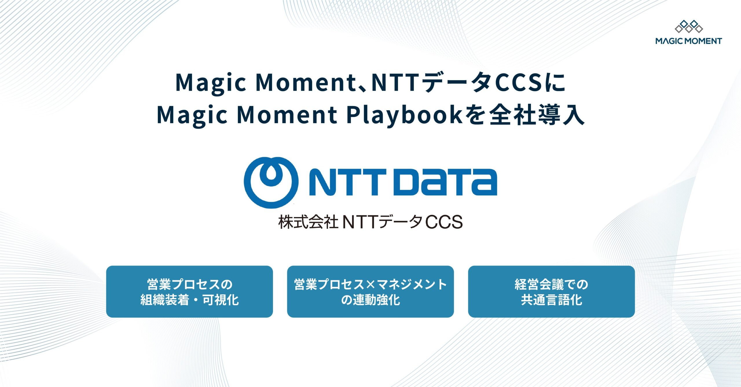 AIセールスプラットフォーム「Magic Moment Playbook」が、システム開発会社のNTTデータCCSで全社導入されました。NTTデータCCSは2023年から営業力強化に取り組んでおり、独自に設計した営業プロセスをPlaybook上に実装し可視化することで、経営層から現場までが同じダッシュボードを見ながら営業状況を把握できる体制を整えました。