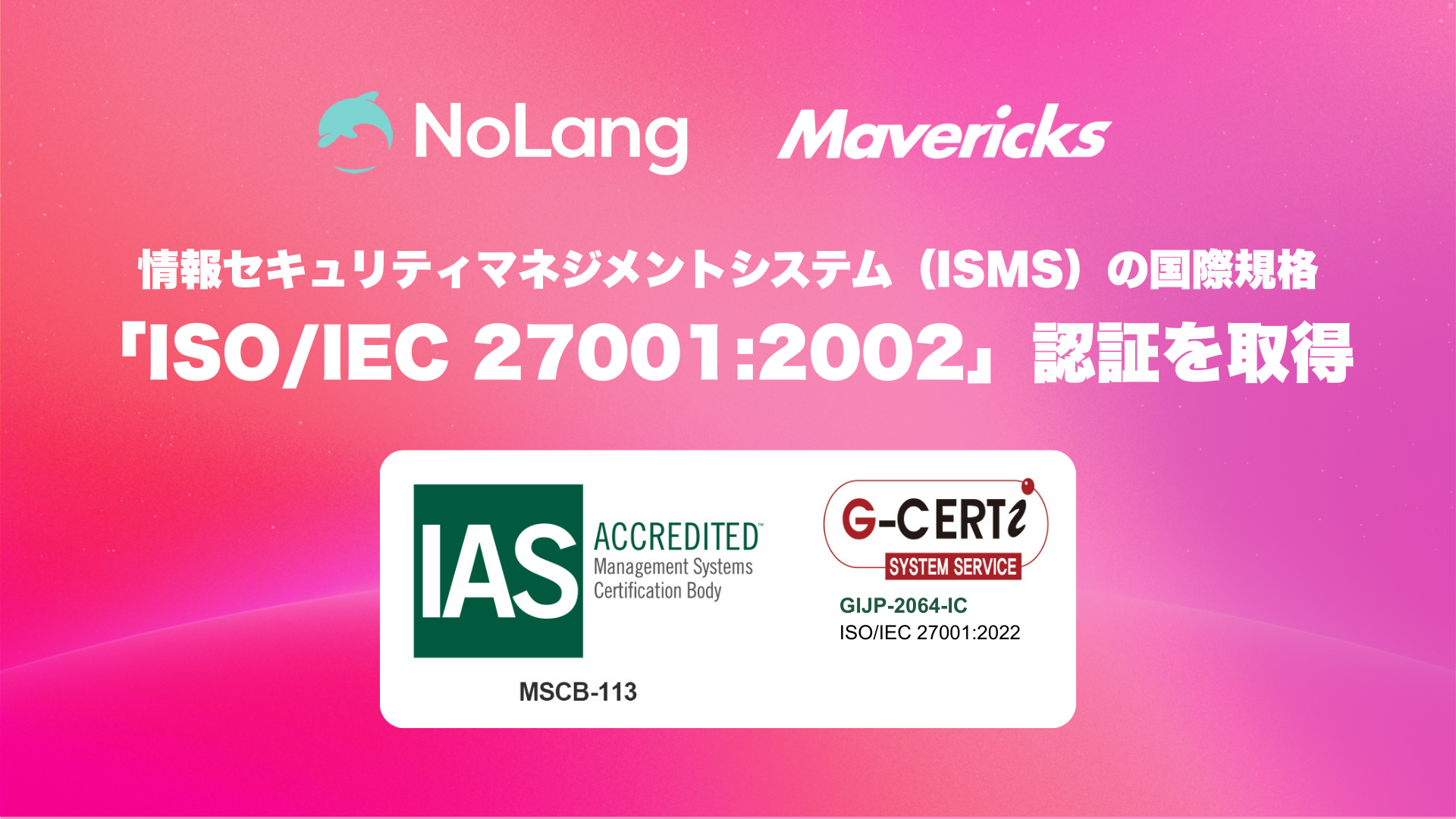動画生成AI「NoLang」を開発する株式会社Mavericks(東京都文京区、代表取締役:奥野将太)は2026年3月2日、情報セキュリティマネジメントシステム(ISMS)の国際規格「ISO/IEC 27001:2022」認証をGCERTI社で取得したと発表しました。登録番号はGIJP-2064-ICで、登録範囲は個人・法人向けSaaSの開発・販売および受託開発業務です。
