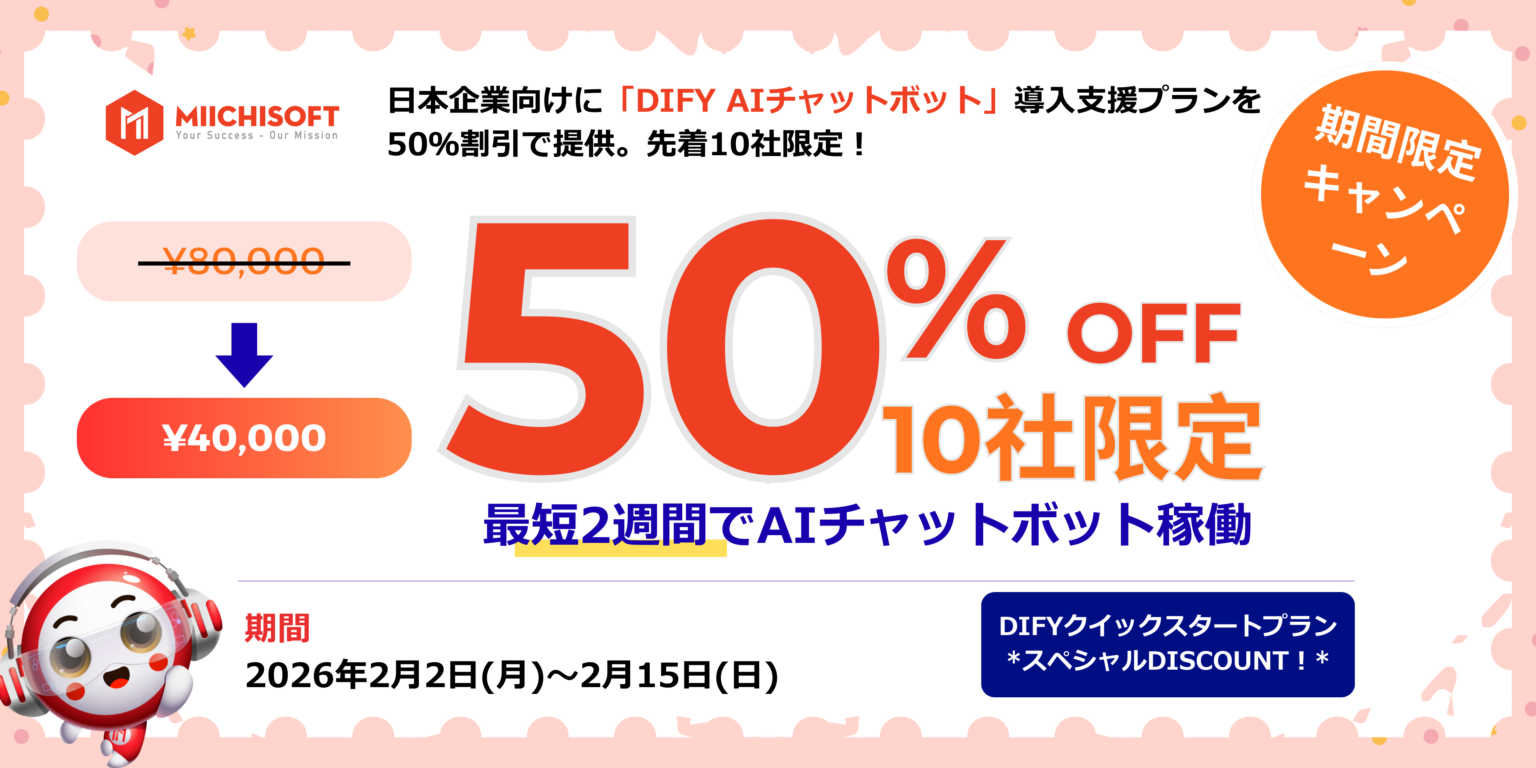 Miichisoftは、日本企業向けにノーコード生成AIプラットフォーム「Dify」を使ったAIチャットボット導入支援「Dify クイックスタート」を、通常8万円から50%オフの4万円で提供します。期間は2026年2月2日〜2月15日で、先着10社限定です。