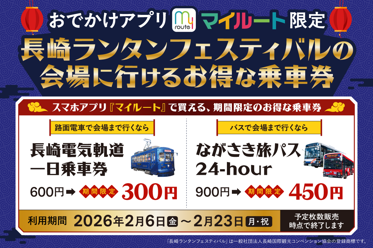 トヨタファイナンシャルサービスは、スマートフォンアプリ「my route」限定で、長崎ランタンフェスティバルの開催に合わせたデジタル乗車券の半額キャンペーンを始めます。販売は2026年2月4日10時から2月23日23時59分までで、路面電車とバスの2種類を各1,000枚限定で用意します。