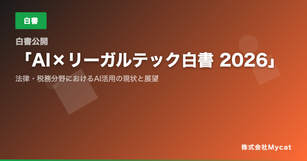 Mycat(東京都目黒区)は2026年3月25日、法律・税務分野におけるAI活用の現状と展望をまとめた白書「AI×リーガルテック白書 2026」を、コーポレートサイトで無料公開しました。慰謝料AIや相続AIなど自社で運営する13のAIサービスのデータ等をもとに分析しています。