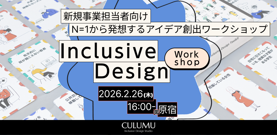 STYZ(東京都渋谷区)は2月26日16時〜18時、インクルーシブデザインスタジオ「CULUMU」による新規事業担当者向けの無料体験ワークショップを、千駄ヶ谷の会場でオフライン開催します。最少催行人数は5名で、5営業日前の時点で未達の場合は延期または中止となる可能性があります。