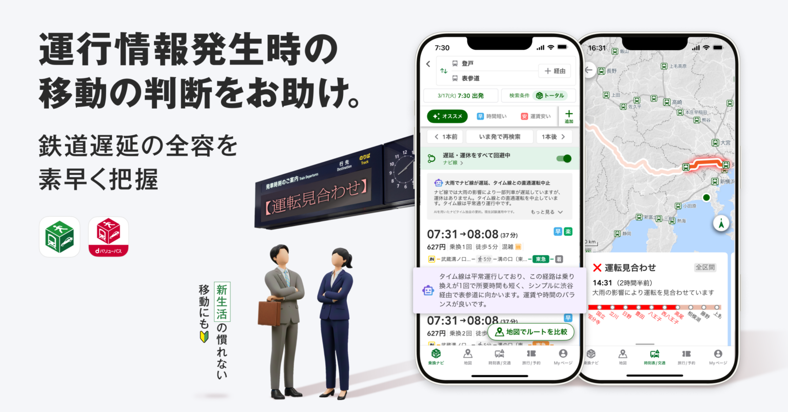 今後はiOS版「NAVITIME」で先行対応し、Android版は順次対応予定です。あわせて「NAVITIME for dバリューパス」では、GPS設定により最寄り駅周辺の運行情報をPUSH通知し、内容をAI要約して表示する機能を近日提供するとしています。