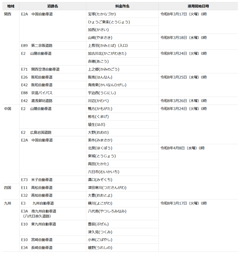西日本高速道路(NEXCO西日本)は、管内の料金所30カ所を新たにETC専用料金所として、2026年3月17日から4月8日の間に順次運用開始します。これにより、ETC専用料金所は現在運用中の64カ所に追加されます。