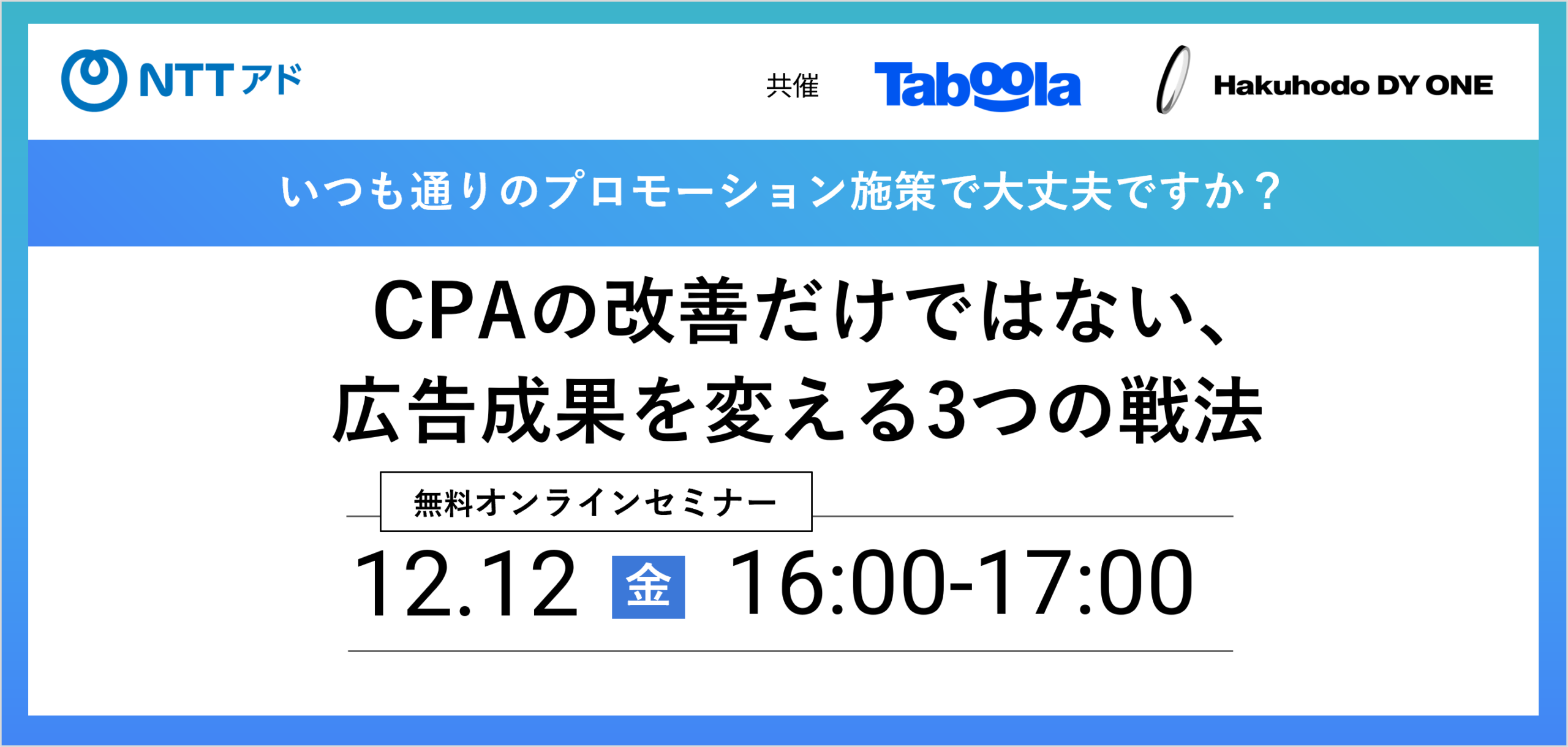 株式会社NTTアドはTaboola Japan株式会社、株式会社Hakuhodo DY ONEと共同で、2025年12月12日(金)16時〜17時に無料オンラインウェビナー「いつも通りのプロモーションで大丈夫ですか?CPAの改善だけではない、広告成果を変える3つの戦法」を開催します。Zoomによるライブ配信で、事前登録制・参加費無料です。