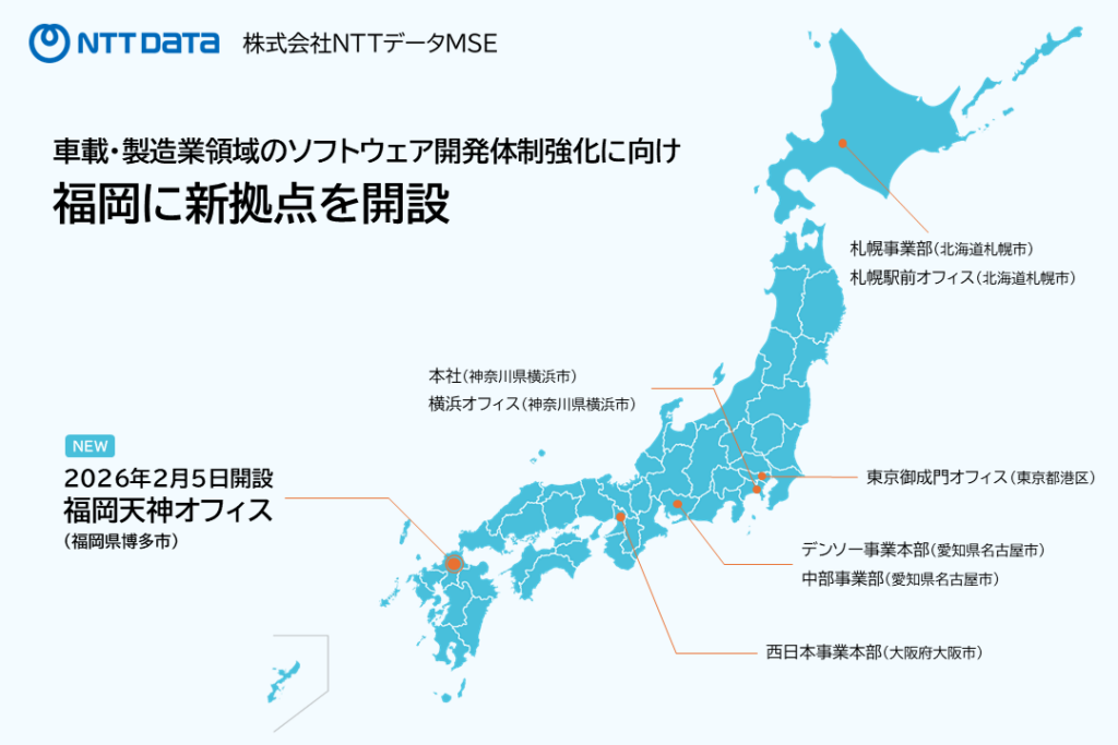 NTTデータMSEは2026年2月5日、車載・製造業領域のソフトウェア開発体制を強化するため、新拠点「福岡天神オフィス」(福岡市中央区天神2-8-35、19階)を開設しました。福岡市地下鉄空港線の天神駅に直結し、同社の従業員数は約1,950名(2025年12月時点)です。
