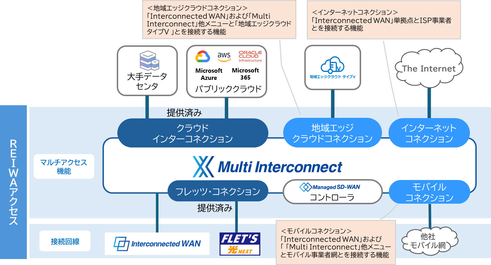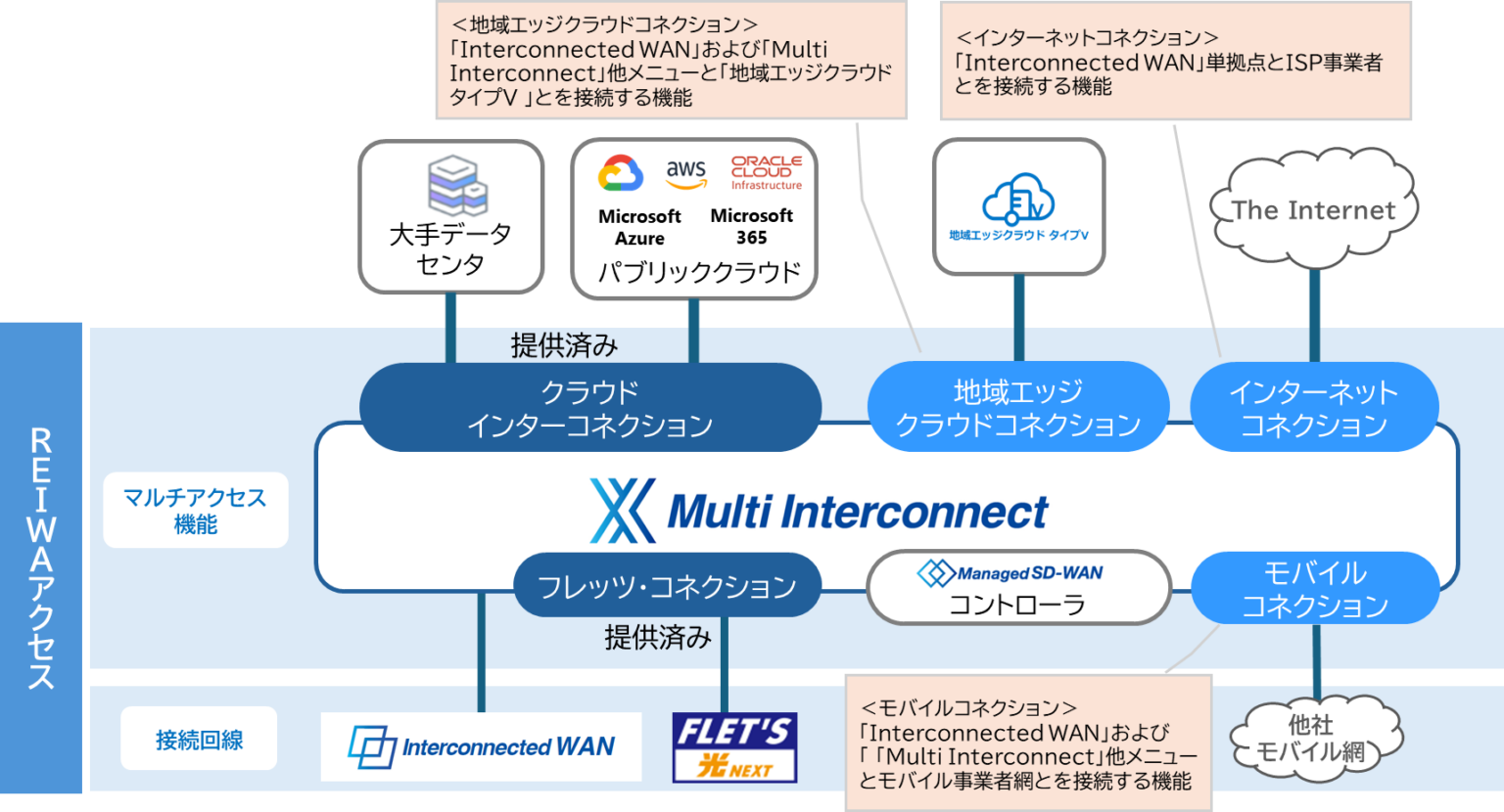 今後は接続機能の追加検討を続け、REIWAアクセスとしてサービス拡張を進める方針です。また、Managed SD-WAN(拠点間通信を集中制御するネットワーク運用サービス)の「Interconnected WAN」「Multi Interconnect」への接続機能も2025年度中の提供開始を予定しています。
