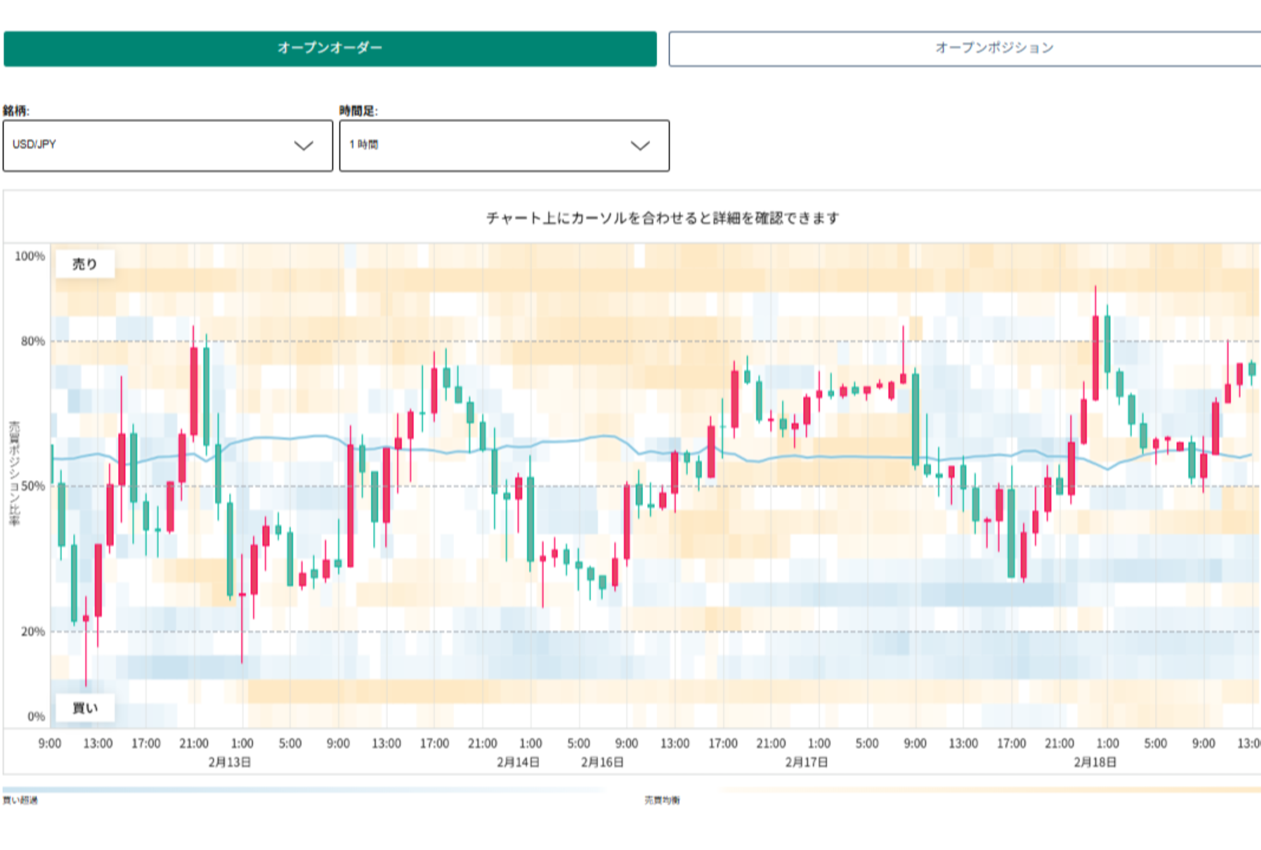 OANDAグループの取引データを使い、特定の価格帯におけるオープンオーダー(未約定注文)とオープンポジション(未決済建玉)の変遷を、ローソク足チャートの背景にヒートマップで可視化します。Delta(買いと売りの差分)も色で示します。