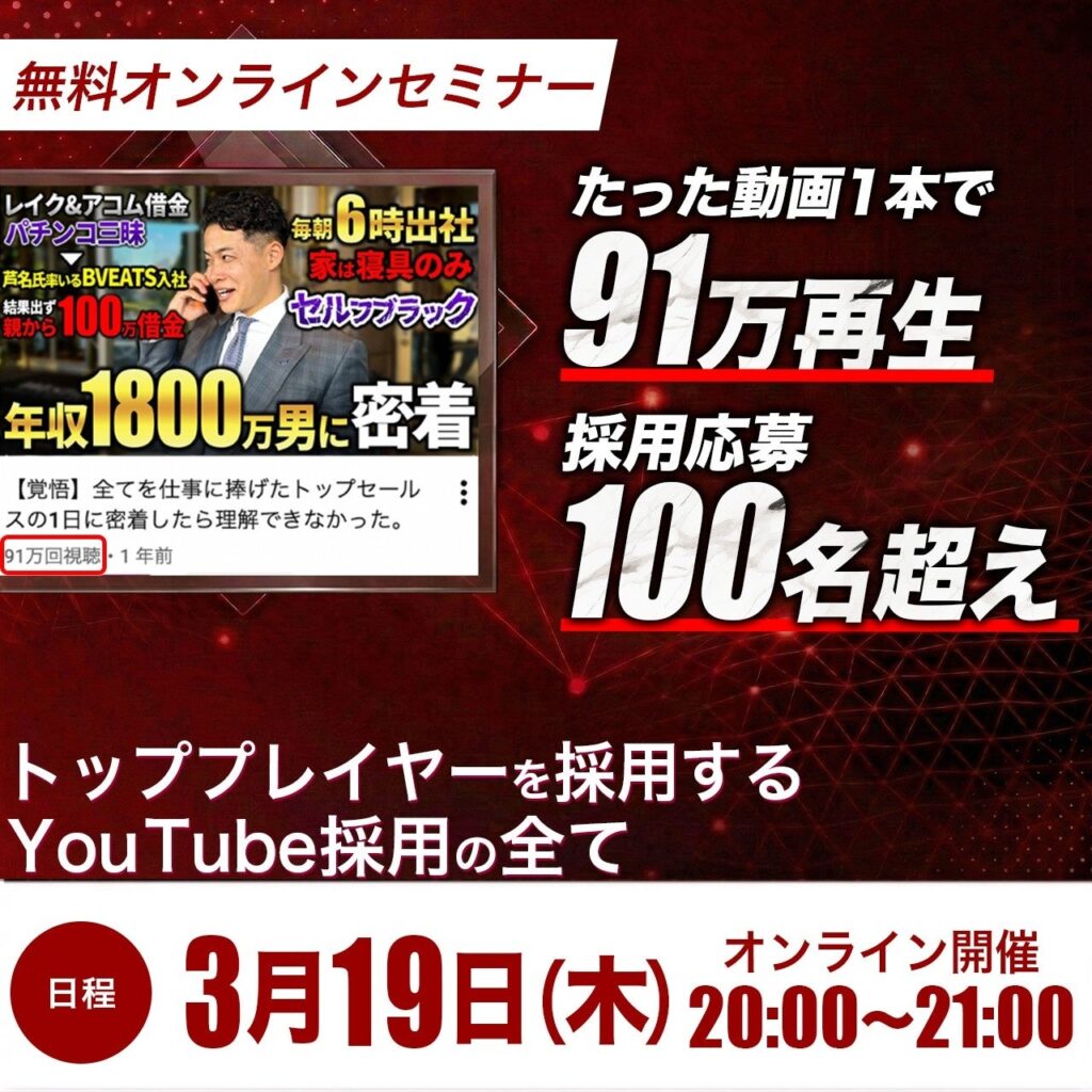 【3/19開催・無料】たった動画1本で91万再生・採用応募100名超え「YouTube×採用戦略」の全てを公開するオンラインセミナー