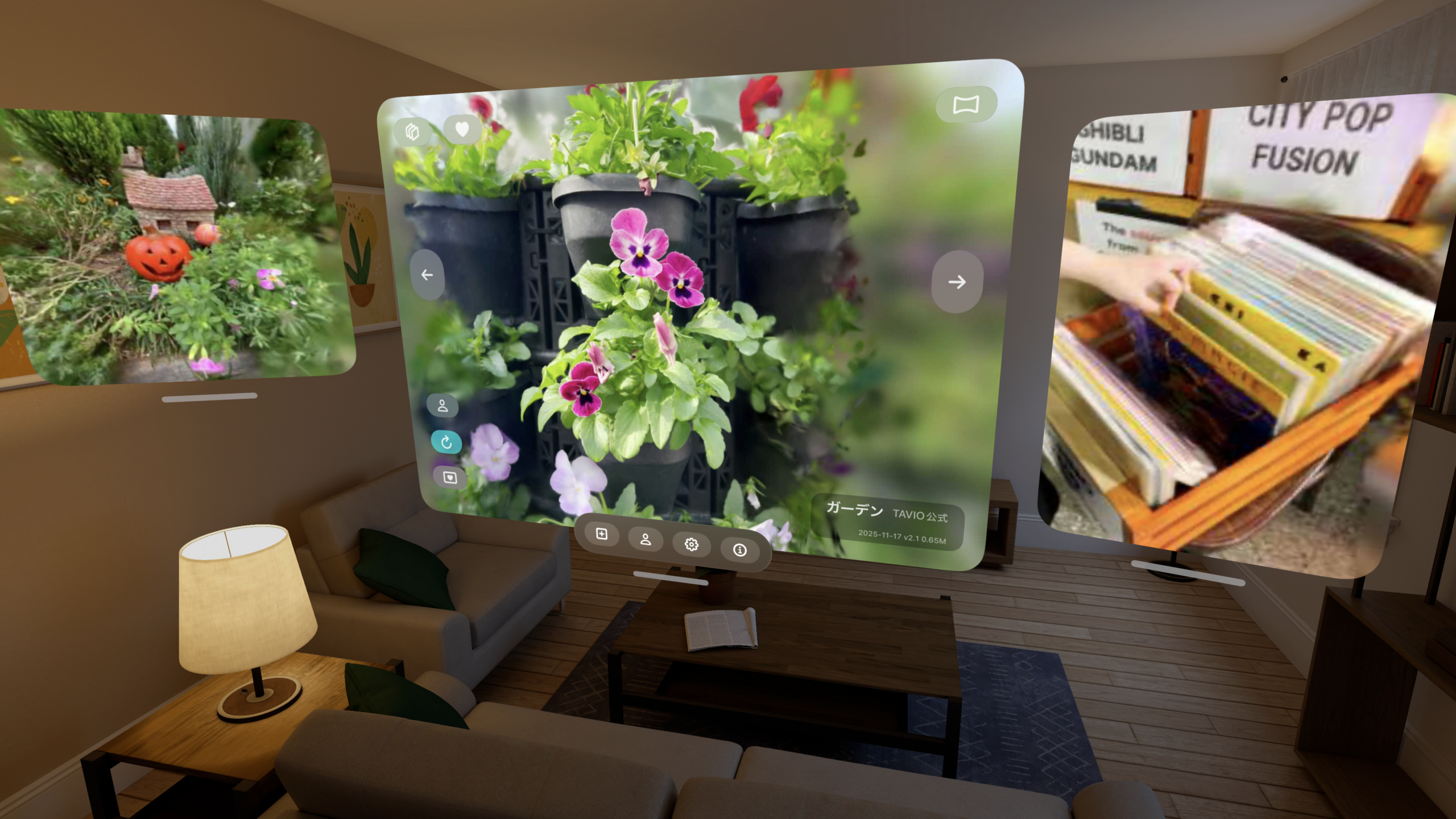 同社の3D生成技術「TAVIO ENGINE」を発展させ、投稿サービス「TAVIO」で生成した3DシーンをVision Pro上でVRとして再生し、現実空間に重ねて表示します。体験モードは「フォトパネル」「フォトスペース」「フォトワールド」の3種類です。