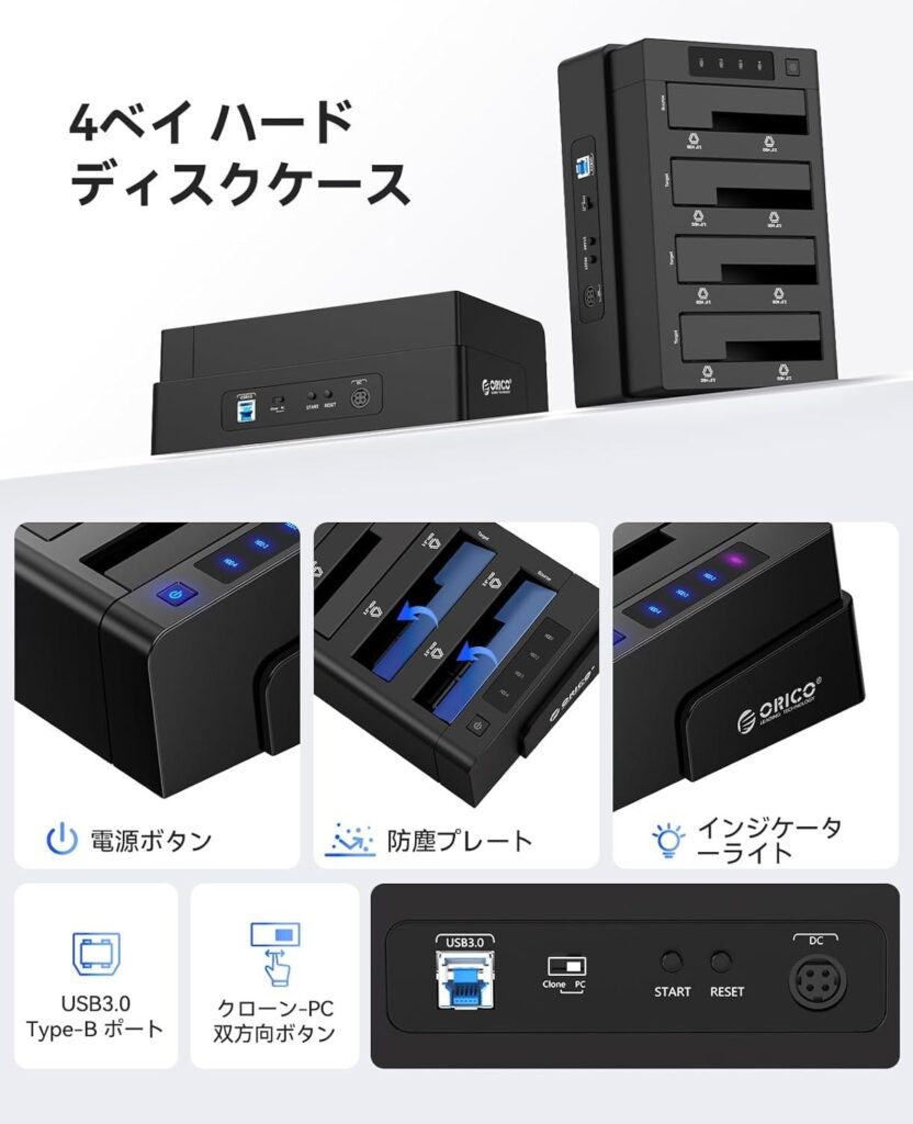 ORICO 4ベイ HDDケース 6648US3(最大40TB、オフラインクローン)購入URL:https://www.amazon.co.jp/dp/B07X1JNVS4