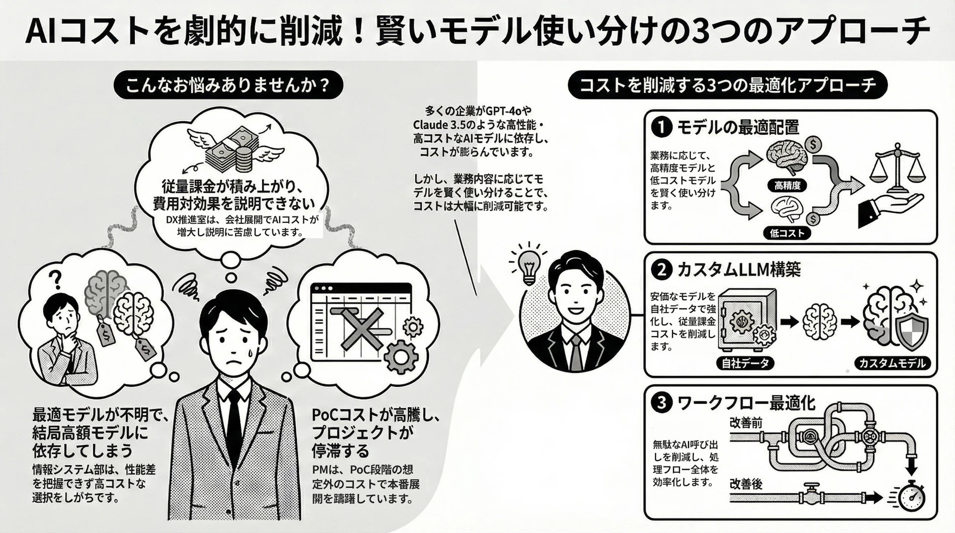 背景には、生成AI導入率が2025年時点で約4割に達した一方、Claude・GPT・Geminiなどの従量課金が積み上がり、PoC段階からコストが想定以上に増える課題があるといいます。同社は「高性能・高額モデルの一律適用」が非効率の要因だとし、ユースケース別のコストシミュレーションを用いて配置を見直します。