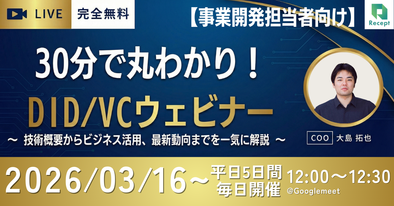 株式会社Recept(東京都千代田区)は、事業開発担当者向けのオンラインウェビナー「30分で丸わかり!DID/VCウェビナー」を2026年3月16日から20日までの平日5日連続で開きます。各日12時〜12時30分の30分枠で、参加費は無料です。スピーカーは同社COOの大島拓也氏が務めます。