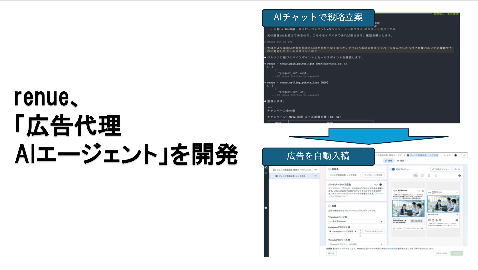 基盤技術にAnthropic社のClaude Codeを採用し、各広告媒体のAPIをrenue社サーバーをハブに統合管理します。キャンペーン設計、画像・動画クリエイティブ制作(短尺動画は15〜60秒程度)、各媒体への入稿、配信後のパフォーマンス監視・分析、改善施策の実行までを自動化し、PDCAを回す設計です。