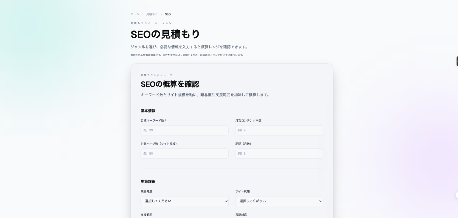 使い方は、必要項目を選択・入力するだけで結果が出る設計です。SEOをこれから始めたい企業や既存施策の見直しを検討する企業、代理店・制作会社の見積もり妥当性を確認したいマーケティング担当者などの利用を想定します。