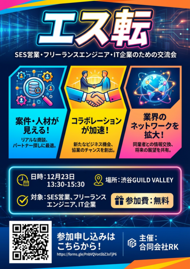 合同会社RKは、SES(システムエンジニアリングサービス)領域の交流会「SESマッピング名刺交換会」を2025年12月23日13:30〜15:30に渋谷のGUILD VALLEYで開きます。参加費は無料で、先着50人です。案件ニーズと人材ニーズを会場内でリアルタイムに表示し、必要な相手と短時間で接点をつくる運用をうたいます。