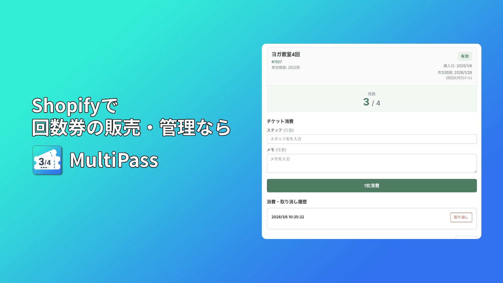 対象はジムやヨガ・ピラティス、エステ、美容サロン、料理教室など回数制サービス事業者です。従来のShopify運用では、購入後のチケット手動発行や残回数・有効期限の確認、期限管理の手作業によるミスが課題になりやすい点を狙い、販売から消費・期限追跡までの自動化を打ち出します。