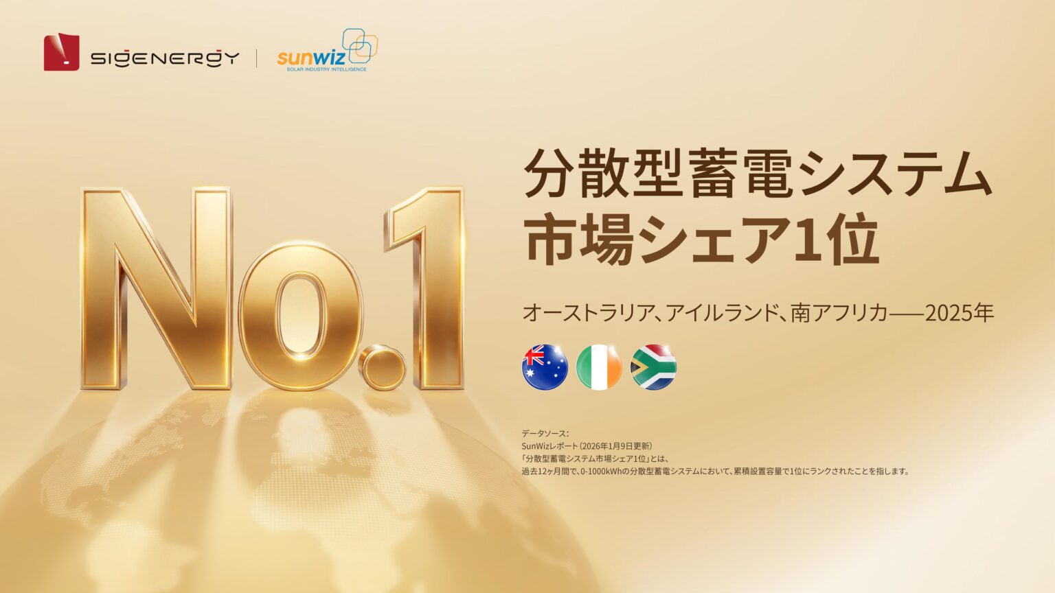調査機関SunWizのレポート(2026年1月9日更新)で、Sigenergyがオーストラリア、アイルランド、南アフリカを含む主要海外市場で分散型蓄電システムの市場シェア首位を獲得した。オーストラリアでは累計設置容量ベースで、2025年3月以降10か月連続で首位を維持している。