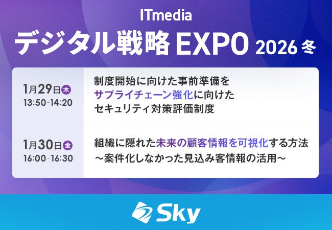 Sky株式会社は、ITmedia主催のオンライン展示会「ITmedia デジタル戦略EXPO 2026 冬」(会期:2026年1月27日~2月25日)に協賛し、会期中に2本のセミナーを実施します。視聴は無料で、所定の登録が必要です。1本目は1月29日13:50~14:20に配信し、経済産業省が2026年度内の運用開始を検討している「サプライチェーン強化に向けたセキュリティ対策評価制度」をテーマに、現時点で公表されている情報を基に事前準備の要点を扱います。2本目は1月30日16:00~16:30に配信し、訪問したものの案件化しなかった見込み客(リード)情報の可視化・活用を取り上げます。組織内で埋もれがちな接点情報を将来の営業活動に生かす方法として、営業名刺管理「SKYPCE」(登録商標)の活用も交えて解説します。サプライチェーンのリスク管理と営業生産性の向上は多くの企業課題であり、同展示会での情報収集需要は高まりそうです。今後は制度検討の進展や、リード活用の運用定着に向けた具体事例の共有が焦点になります。