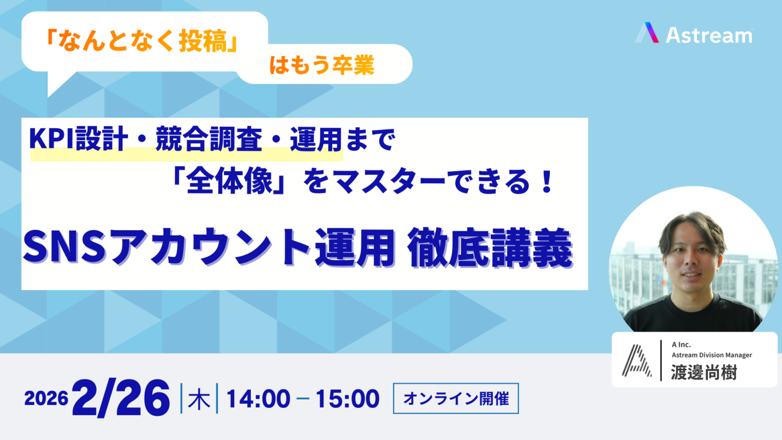 内容は、SNS運用で課題になりやすい「設計不足」に焦点を当て、目的から逆算するKPI設計や、データに基づく競合分析、戦略立案など運用の全体像を整理します。登壇は同社Astream事業部長の渡邊尚樹氏です。
