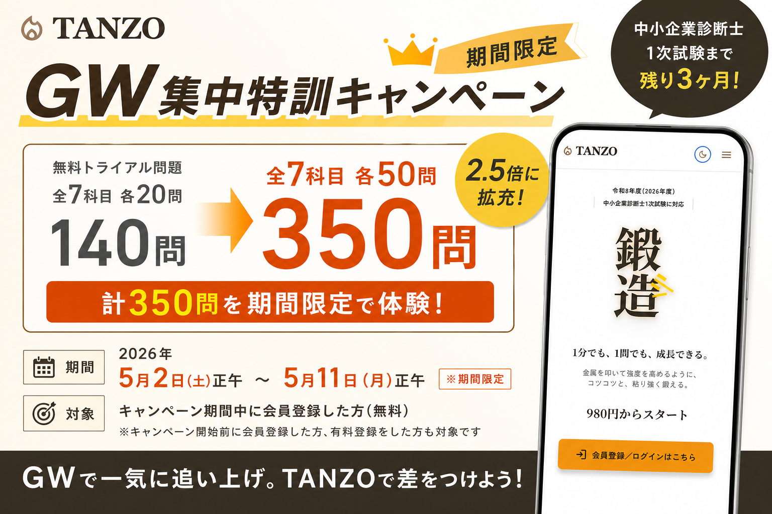 TANZO株式会社(東京都港区)は2026年5月2日正午から5月11日正午まで、論点特化型オンラインドリル「TANZO®」の無料トライアル問題を、全7科目各20問(計140問)から各50問(計350問)へ増やすGW限定キャンペーンを実施します。対象は期間中の会員登録者で、開始前の登録者や有料登録者も含まれます。