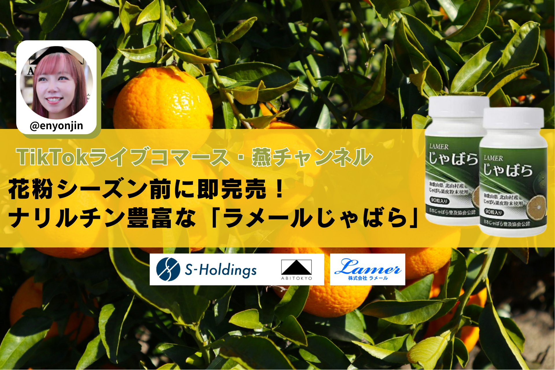 株式会社Sホールディングス(東京都品川区)は2026年2月24日、TikTokライブコマース「燕チャンネル」でサプリメント「ラメールじゃばら」を販売し、開始約30分で約1,100個を完売しました。売上は約330万円です。運営は同社、企画・配信はABITOKYO、商品提供は株式会社ラメールが担いました。