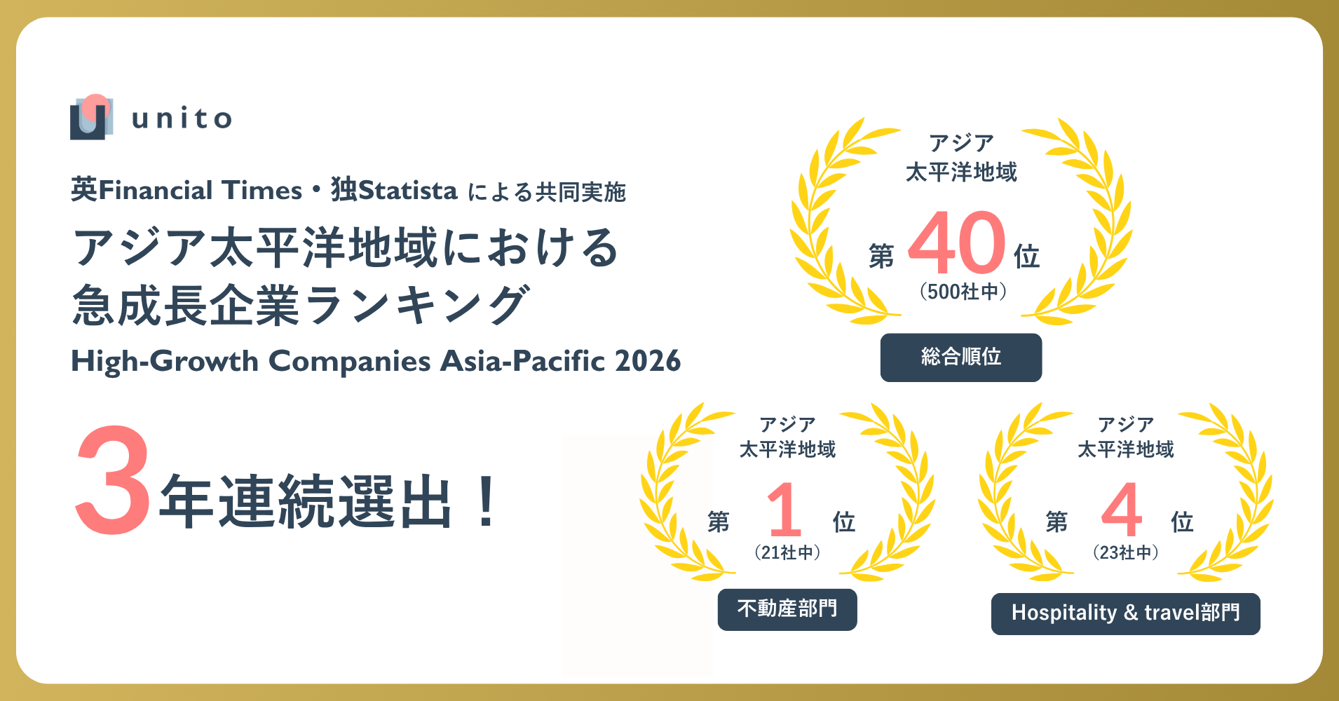 同ランキングは、アジア太平洋地域の企業を対象に、上場・非上場企業から提供されたデータを基に売上高成長率で上位500社を選びます。Unitoは部門別でも、Real estateで21社中1位(国内1位)、Hospitality & travelで国内2位、IT & softwareで国内3位に位置づけられました。