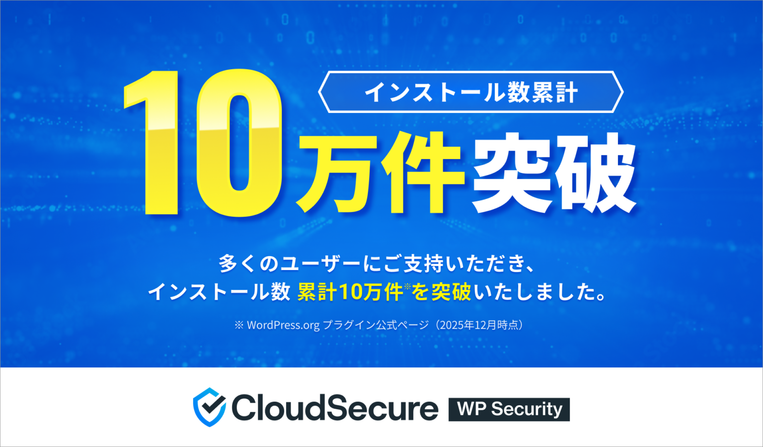 クラウドセキュア株式会社(大阪市北区)が提供するWordPress向け無料プラグイン「CloudSecure WP Security」の累計インストール数が、WordPress.org掲載データベースで2025年12月時点に10万件を超えました。到達の公表は2026年1月14日です。