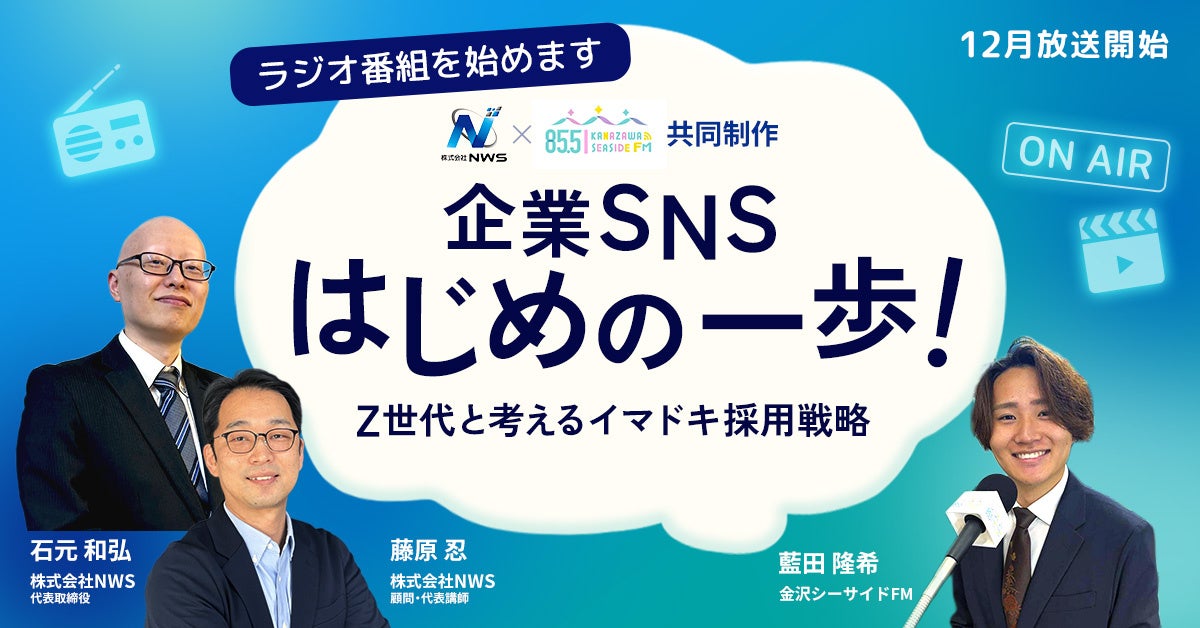 採用に悩む企業がSNS運用をゼロから始める過程を追うラジオ番組「企業SNS運用はじめの一歩!Z世代と考えるイマドキ採用戦略」が、2025年12月22日15時に初回放送を迎えます。放送は神奈川県横浜市の金沢シーサイドFM(85.5MHz)で、毎月第4月曜日の15時から約15分です。制作は株式会社NWS(兵庫県西宮市)と同局が担います。番組にはZ世代のNWSインターン生、企業SNS運用の専門家で年間100社以上の研修実績を持つ藤原忍氏、NWS代表の石元和弘氏らが出演し、「応募が来ない」「内定辞退や早期離職が多い」などの課題をSNS活用の観点から整理します。SNSに不慣れな企業が抱きがちな不安点も扱い、基本用語や進め方を平易に解説する構成です。今後は、企業規模を問わず取り入れやすい採用の打ち手を継続的に共有し、SNS運用の内製化ニーズの高まりに沿った実践例として注目されます。